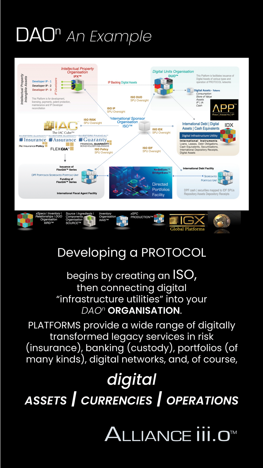 Its primary DAOs include a PROTOCOL DAO focused on its core participants whose role is to expand ECOSYSTEM PROTOCOL usage, an IGX Protocol comprised of ECOSYSTEM related professionals, its Currency Protocol, and DX-Digital Transformation professionals.