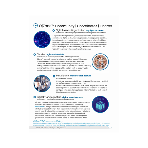 O|ZONE™ is an architecture designed for creating local COMMUNITY connectivity and Initiatives in a Private | Public | Partnership model, which may connect from Community to Community internationally.